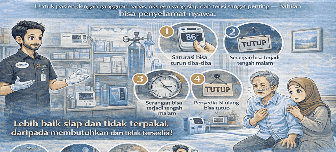Banyak keluarga baru menyadari pentingnya oksigen di rumah saat kondisi sudah darurat. Padahal, untuk pasien dengan gangguan pernapasan atau riwayat saturasi rendah, oksigen bukan sekadar alat tambahan — tapi bisa menjadi penopang keselamatan.